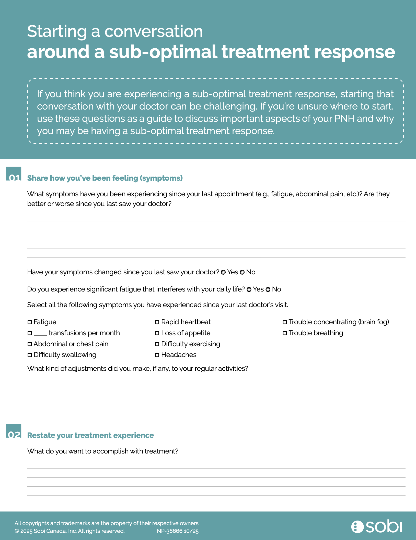 A sub-optimal treatment response is when your paroxysmal nocturnal hemoglobinuria (PNH) is not being adequately controlled by your current treatment. This can result in PNH signs or symptoms that persist or reappear, affecting your quality of life.